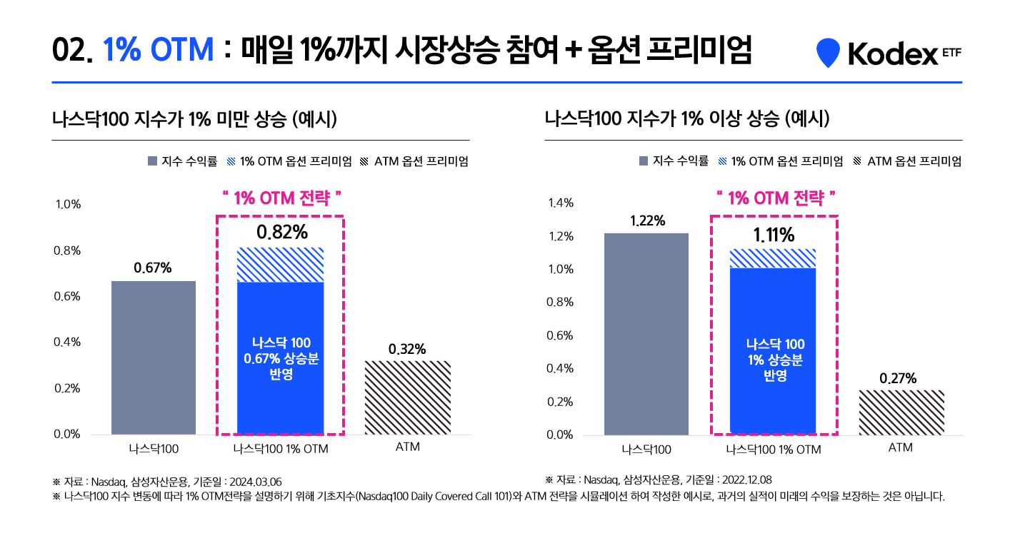 커버드콜 전략은 특정 자산을 매수하는 동시에 해당 자산에 대한 콜옵션을 매도하는 것을 의미합니다. 콜옵션 매도 자체의 개념은 다소 어렵지만, 콜옵션은 ‘매수할 권리’를 의미합니다. 특정 자산의 주가가 1만원이라고 가정하고, 주가가 하락한다고 가정해 보겠습니다. 그러다가 주가가 하락하는 만큼 매수권을 프리미엄을 붙여 매도할 수 있고, 주가가 오르면 손해를 보고 매도해야 하는 상황이 발생한다. 결론적으로, 내가 구매한 자산이 하락하면 콜옵션 매도 전략에 적합합니다. 프리미엄을 받고 올라가면 돈을 잃게됩니다. 그러나 커버콜 전략을 적용하는 상품은 이를 동시에 활용한다. 주가가 하락할 때 손실을 방지하기 위해 이 콜옵션을 사용합니다. 반대로 주가가 오르면 그에 따른 이익을 얻지만 손실의 일부는 콜옵션으로 보전된다. 그러면 위와 같이 주가가 하락하게 됩니다. 수익률은 부분적으로 보호되지만 주가가 지나치게 오르면 수익률이 일정 범위로 고정된다.
