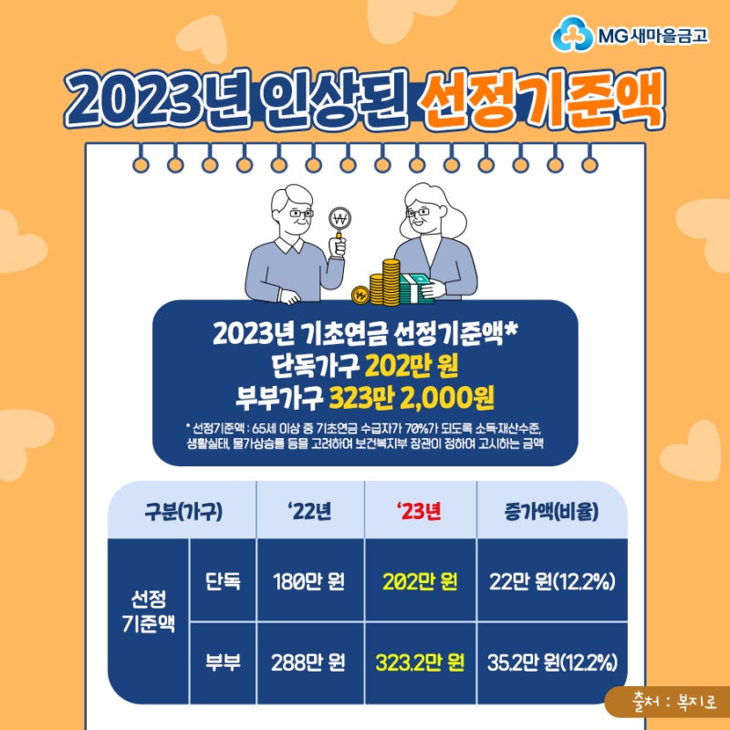 몇 년 전 부모님 기초연금을 신청했는데, 올해부터 아버지의 퇴직과 근로소득이 없어 급여액이 늘어났다. 기초연금 수급 자격, 둘이 받을 수 있는 금액, 노령연금과 어떻게 다른지 자세히 알아볼까요? .기초연금은 65세 이상 노인의 안정적인 노후생활을 지원하고, OECD 국가 중 세계 최고 수준인 노인의 상대적 빈곤율을 해소하기 위해 노후급여를 제공하는 복지정책이다. 노령연금과 어떻게 다릅니까? 기초노령연금, 기초연금은 65세 이상 노인으로서 소득과 재산여건을 충족하는 사람에게 지급하는 복지제도이며, 노령연금이란 국민연금을 말하며, 납입기간과 금액에 따라 차등지급되는 연금제도입니다. 국민연금 금액이 많으면 기초연금액이 삭감될 수 있으나, 소득과 재산 요건을 충족하면 기초연금과 노령연금을 동시에 받을 수 있습니다. 기본연금 적용대상 : 대한민국 국민으로서 65세 이상 대한민국 거주자로서, 소득 및 자산(소득인정금액)이 선택기준 중 하위소득 범위에 속합니다. 70% 이하의 노인에게 지급됩니다. 소득 인정에는 사업, 재산, 연금, 무료임대소득, 자동차, 회원권 등 근로소득 이외의 모든 소득이 포함된다. 2023년 1인 가구 선택기준은 202만원, 기혼가구 323만2000원이다.