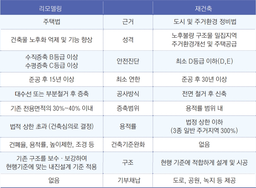 반면 재건축은 리모델링에 비해 안전진단, 용적률 등 규제가 훨씬 엄격하고, 공사 기간이 10년 이상 소요된다는 단점이 있다. 노조설립, 이전, 철거 등 절차도 매우 복잡하고 시간도 오래 걸린다. 리모델링은 수직확대 리모델링, 바닥면적을 늘리는 리모델링, 지하주차장을 확장하거나 신설하는 리모델링으로 구분된다.