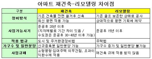 반면 재건축은 리모델링에 비해 안전진단, 용적률 등 규제가 훨씬 엄격하고, 공사 기간이 10년 이상 소요된다는 단점이 있다. 노조설립, 이전, 철거 등 절차도 매우 복잡하고 시간도 오래 걸린다. 리모델링은 수직확대 리모델링, 바닥면적을 늘리는 리모델링, 지하주차장을 확장하거나 신설하는 리모델링으로 구분된다.