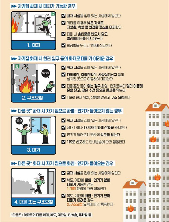 아파트에 화재가 발생하면 어떻게 해야 할지 생각해 봅시다.