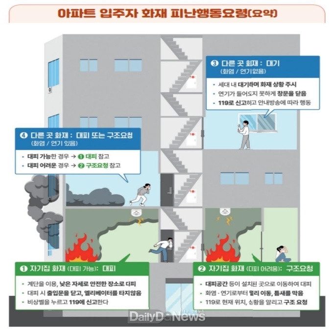 최근 저희 아파트에서는 ​​한 주민(실내에서 흡연으로 추정)으로 인해 화재감지기가 작동되고, 해당 아파트에 대피 안내 방송이 나와 주민들이 대피하면서 소란이 빚어졌습니다. 각종 언론보도에 따르면 화재사고로 인한 인명피해가 늘어나고 있어 화재가 발생하면 그 중요성이 더욱 커진 만큼, 이번 기회에 국민이 발표하는 자료와 뉴스기사에서 제시되는 핵심 내용을 간략하게 살펴보도록 하겠습니다. 아파트 화재 발생 시 대피 요령을 기관 등에 안내합니다.