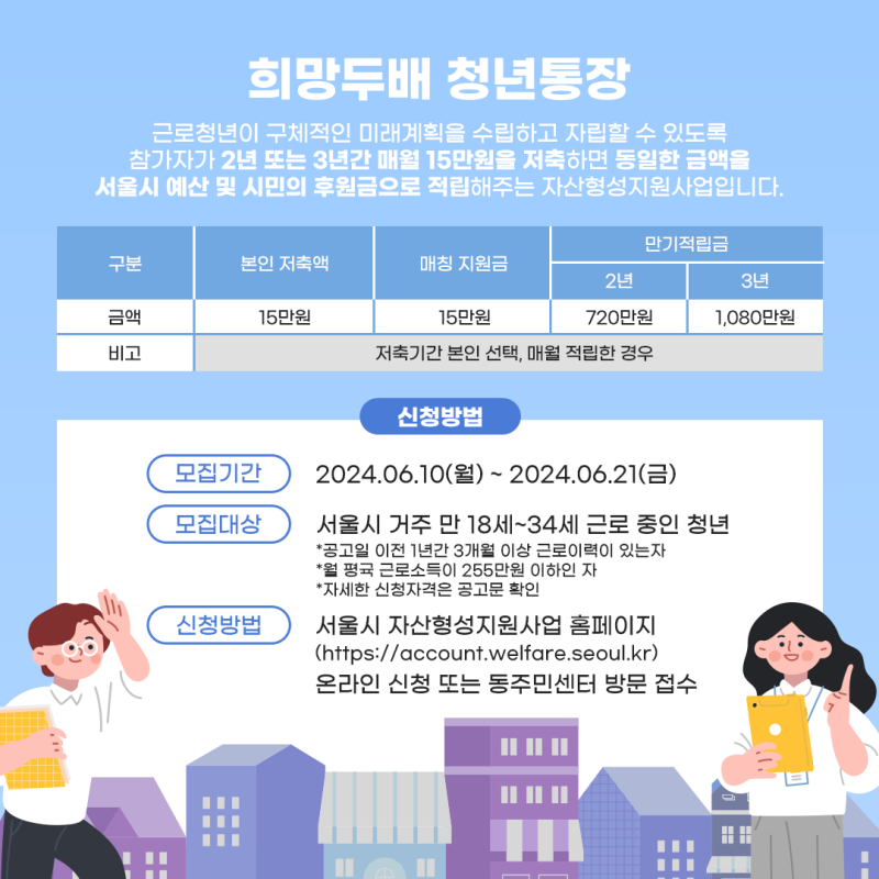 일하는 청년들을 위한 종자자금과 자녀들의 교육자금을 마련하기 위해 서울시가 최대 2배의 저축을 지원하는 희망더블청년통장, 금나래통장 참여자를 모집합니다! 신청기간 2024.06.10.(월) ~ 06.21.(금)